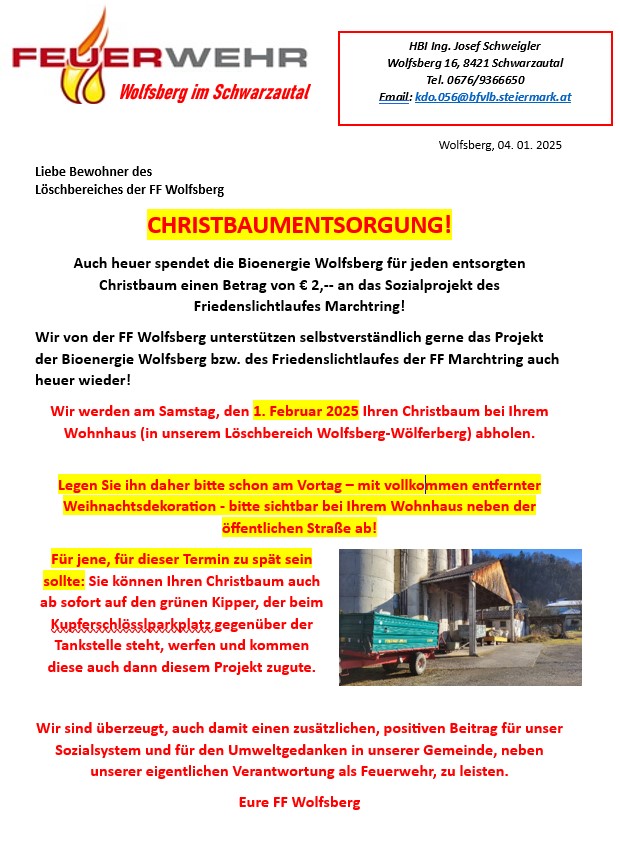 Die Feiertage nähern sich dem Ende und es steht in den nächsten Tagen und Wochen sicher bei Allen die Frage an, wohin mit dem Christbaum? Wir unterstützen natürlich auch selbstverständlich heuer wieder die Aktion der Bioenergie Wolfsberg, mit der nicht nur Euch geholfen wird, sondern auch Anderen! Mehr dazu in der Fotobeilage! Eure FF Wolfsberg!