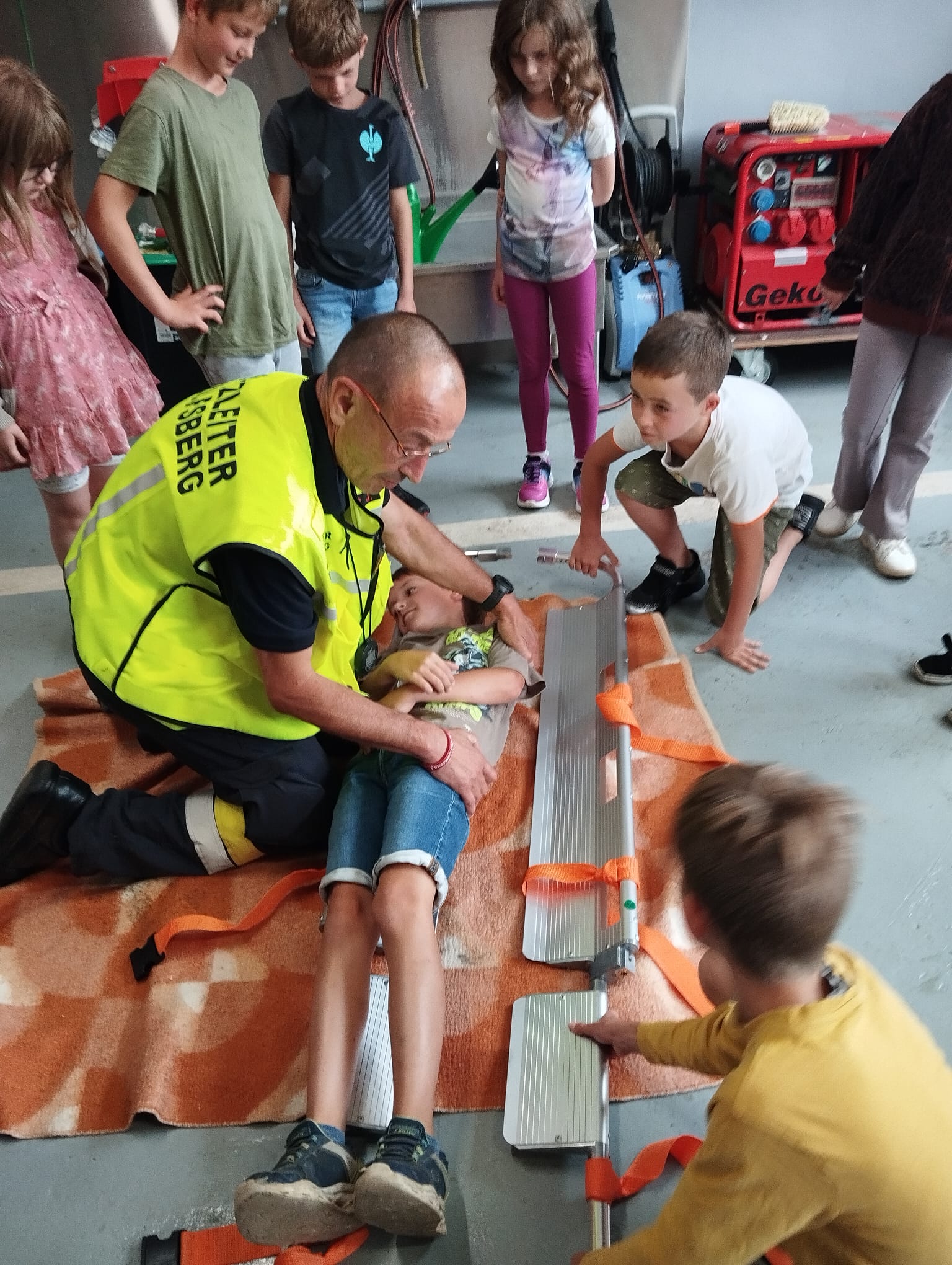 Nach einer Vorstellung unserer Jugendarbeit, unserer Fahrzeuge und unseres Feuerwehrhauses wurde daher dann der Schwerpunkt auf den Umgang mit verletzten Personen gelegt und wurden die Unterschiede der einzelnen Rettungsgeräte erläutert. Letztendlich führten die Kinder eine Personenrettung mittels Schaufeltrage perfekt durch.