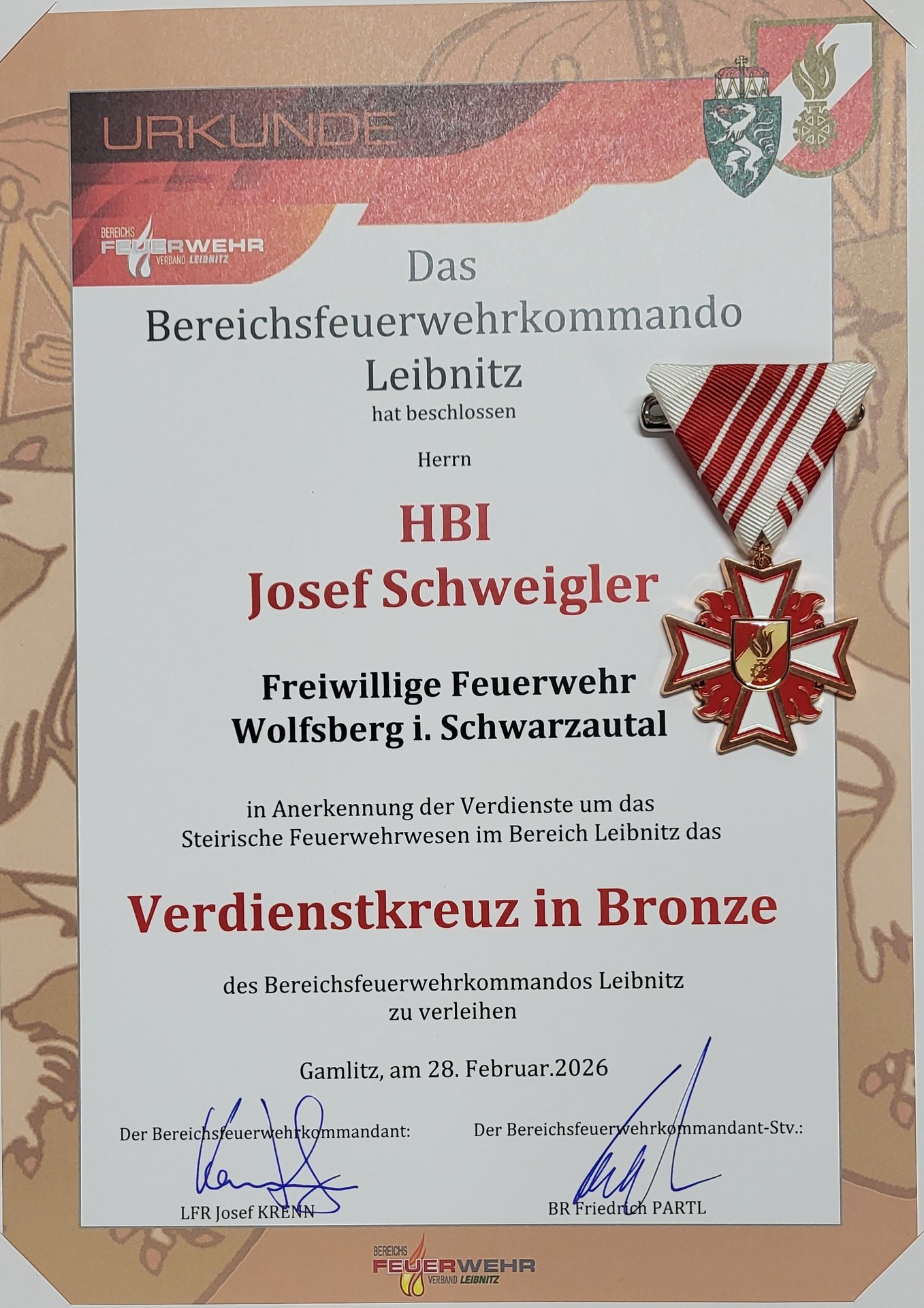 Eine besondere Ehre wurde mir persönlich mit der Auszeichnung des Verdienstkreuzes in Bronze des BFV Leibnitz zuteil, wofür ich mich an dieser Stelle auch nochmals herzlich bedanke!