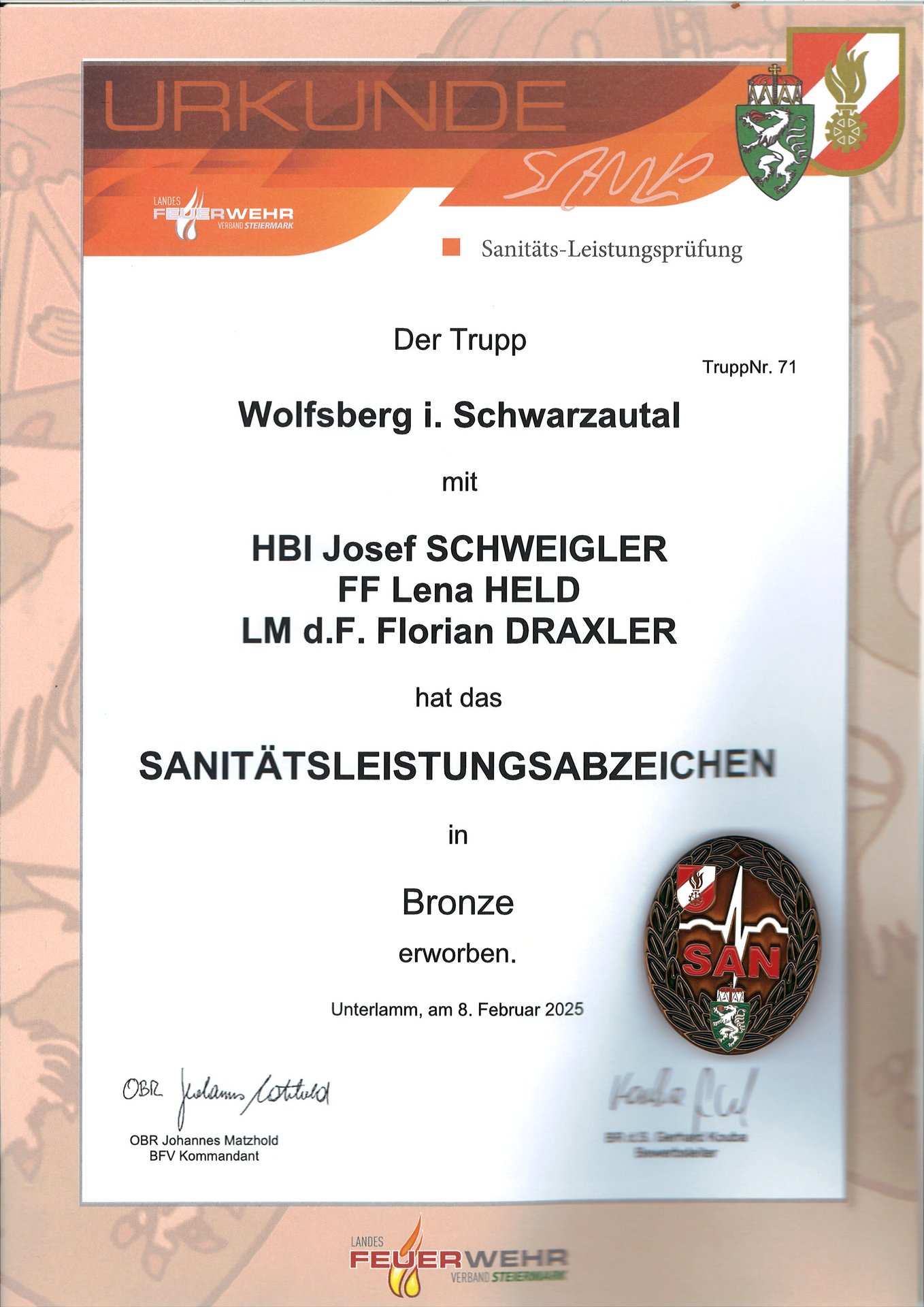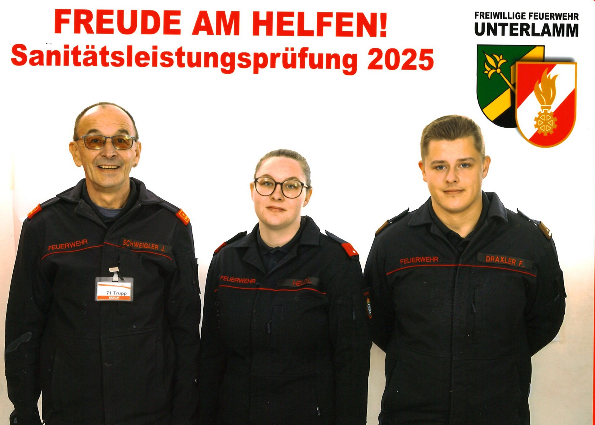 Mit dem heutigen Tag wurde erstmals in der 128-jährigen Geschichte unserer Wehr eine Leistungsprüfung einer Mannschaft, die nur aus unserer Wehr bestand, absolviert. Mit dankenswerter Genehmigung unseres Bereichsfeuerwehrkommandanten (da es aus terminlichen Gründen ein gemeinsames Antreten beim Bewerb im eigenen Bereich nicht möglich war) hat unser Sanitäts-Trupp mit FF Lena Held, LM d F. Florian Draxler und HBI Sepp Schweigler, nach intensiver Vorbereitung, heute das Sanitätsdienstleistungsabzeichen in Bronze bei der Prüfung in Unterlamm (BFV Feldbach) mit der Höchstpunkteanzahl erworben.