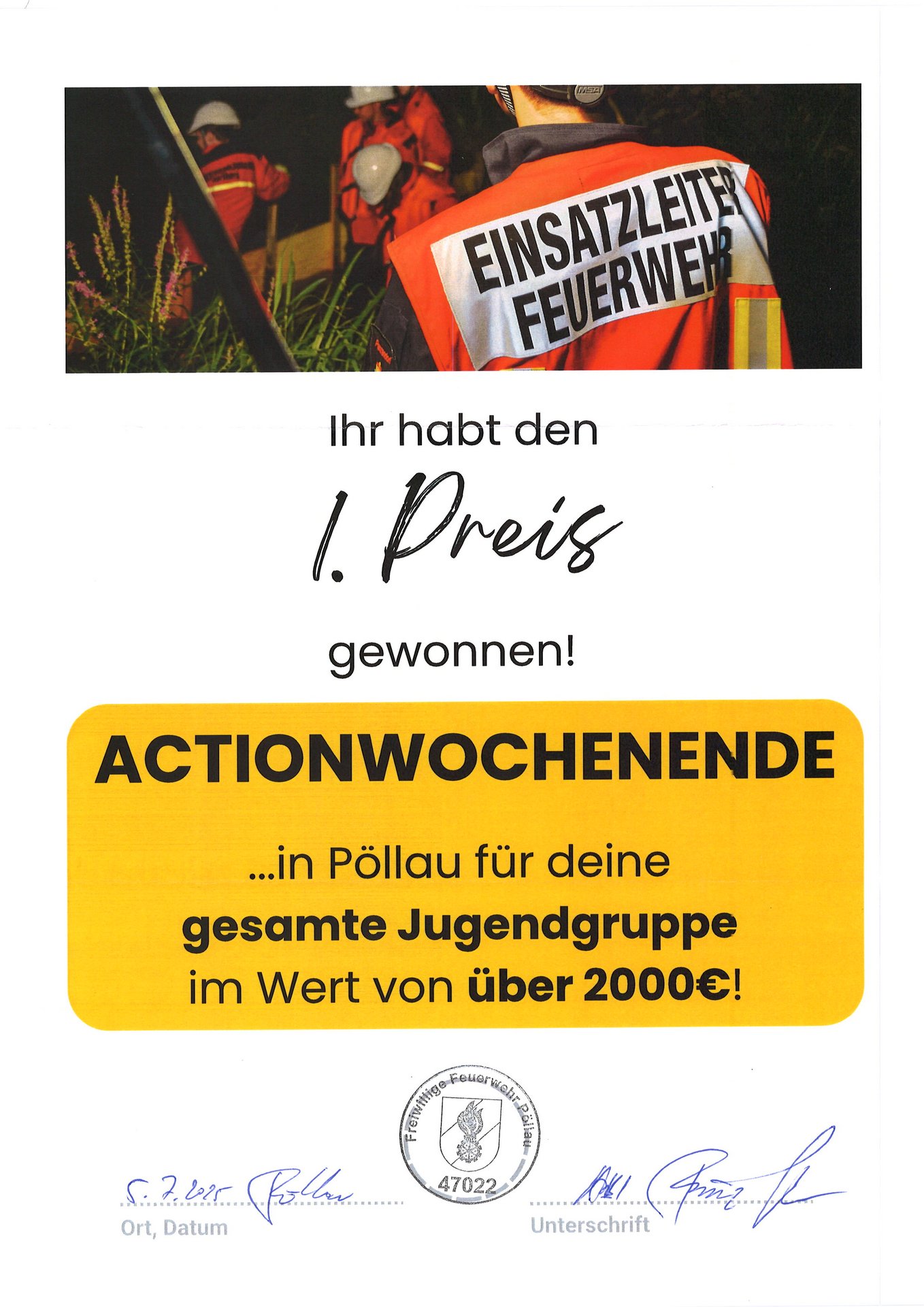 3. worüber wir uns natürlich ganz besonders freuen: Wir durften beim Gewinnspiel mit Fotoshooting den 1. Preis mit nach Hause nehmen. Nämlich ein Actionwochenende im Pöllauertal im Wert von über € 2.000,-- mit der gesamten Feuerwehrjugend unserer Feuerwehr! Liebe Kameraden der FF Pöllau, wir freuen uns darauf!